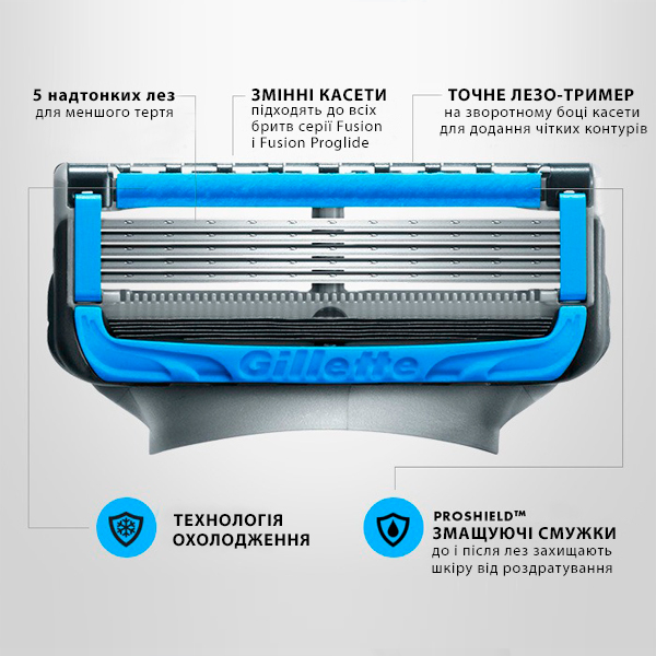 Унікальні змінні касети Gillette Fusion Proshield Chill оснащені п'ятьма понад гострими і надзвичайно тонкими лезами, які помітно знижують тертя з поверхнею шкіри для більш гладкого гоління всіх ділянок особи. Вони виконані з неймовірно високоякісного металу, що підтверджує їх міцність і тривалий час служби. Гострота лез дозволить без особливих зусиль зрізати волосинки будь-якої жорсткості. Вони сбреют як найменші волоски або довге волосся, так і щетину в будь-якому необхідному місці.
